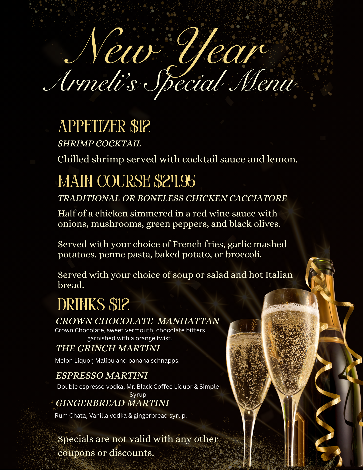 Select Appetizers include: Garlic Bread, Breaded Mushrooms, 5 Spicy Wings, Half order of Eggplant and Half order of shredded onion rings. (Special is subject to change without notice. Please ask a staff member for more details).